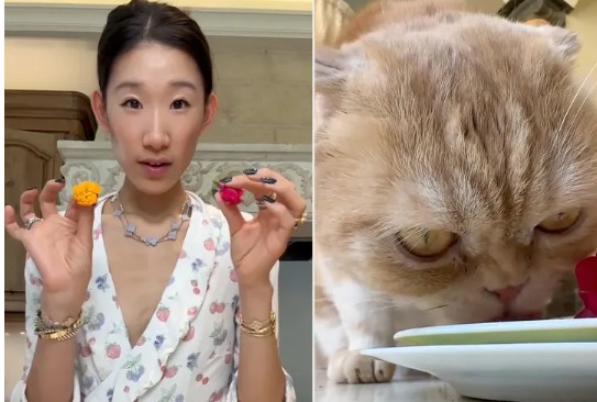 Influencer Becca Bloom shared the meal she recently made for her cat Oscar, which included sushi-grade salmon sashimi, a tuna bone broth blend, a soft-boiled quail egg, and salmon roe caviar